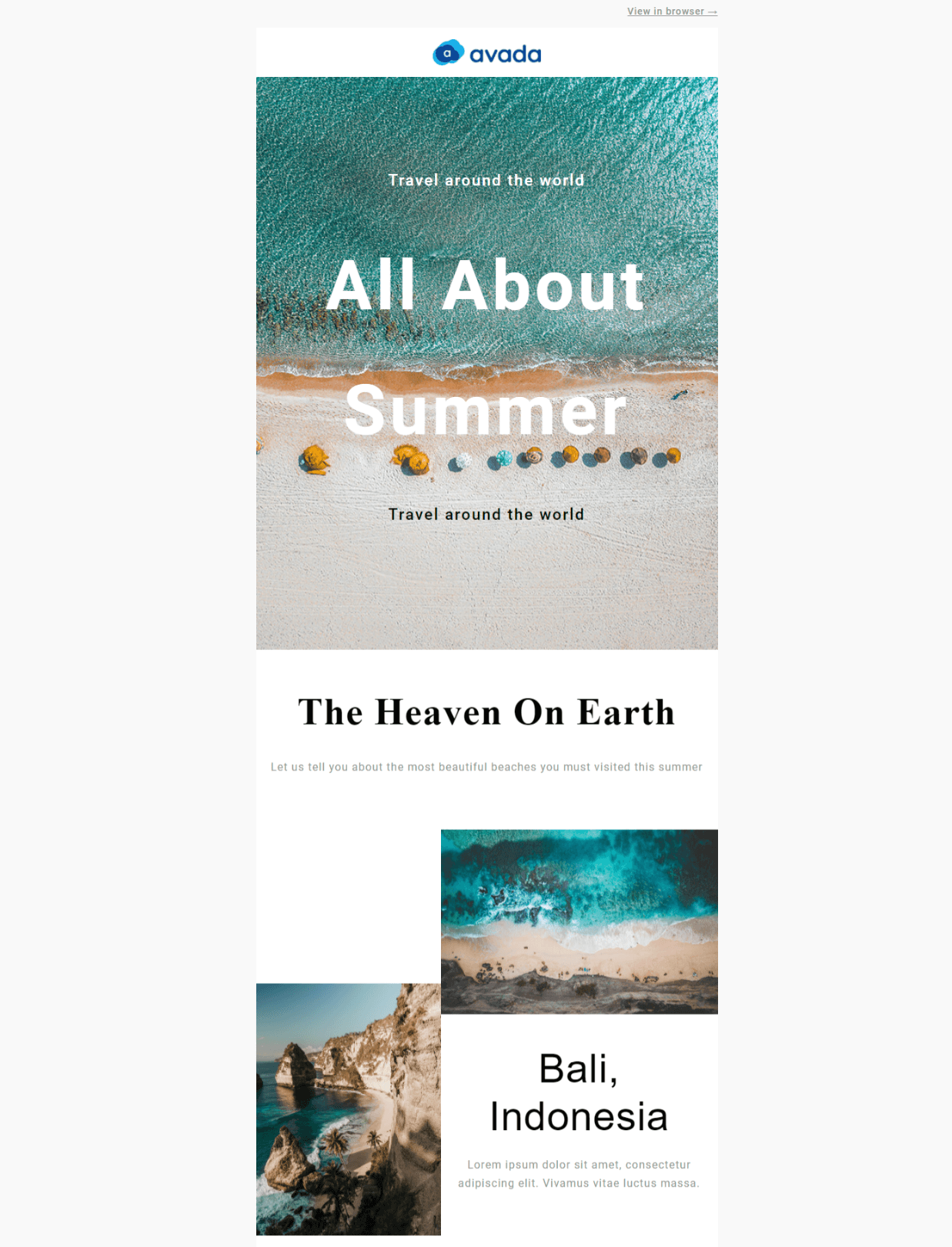 Abaixo está um exemplo de modelo de newsletter por e-mail que mostra aos assinantes as praias mais bonitas que eles devem visitar no verão.