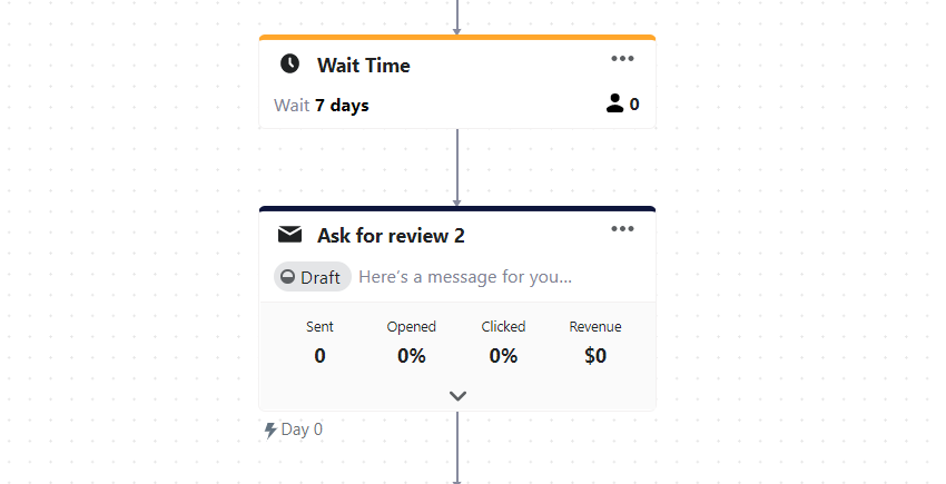{% raw %} Hi {first_name}! Thanks for your recent order. We would appreciate it if you help other customers and us out by leaving a review of your purchase. As thanks, we offer X% off on your next purchase in exchange for your honest opinion. Looking forward to hearing from you soon! In case you have any questions, please reply directly to this email and let us know! We always love to help! ️ {% endraw %}E-mail nº 3 . Se eles ainda não deixarem uma avaliação, você poderá enviar outro e-mail uma semana depois. O terceiro e último e-mail do fluxo de trabalho é um pouco mais longo.