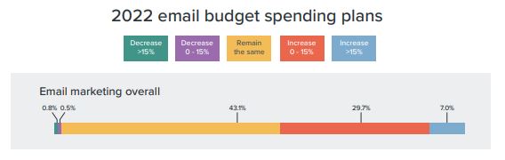 Além disso, devido à crescente prioridade do e-mail, quase 37% das empresas pretendem aumentar seu investimento geral em e-mail em 2022. Apenas 1,3% planeja diminuir seu orçamento de e-mail. Antes da pandemia, apenas 11% das empresas aumentavam os orçamentos, enquanto 35% os diminuíam, provando o quanto o e-mail é inestimável na economia atual.