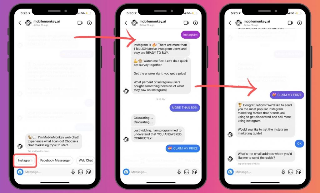 De fapt, puteți configura o pâlnie automată pentru a răspunde mesajelor DM utilizând un instrument precum MobileMonkey. Așadar, dacă biografia ta spune „DM-mi pentru mai multe informații” și un brand curios face exact asta, primește un răspuns imediat.