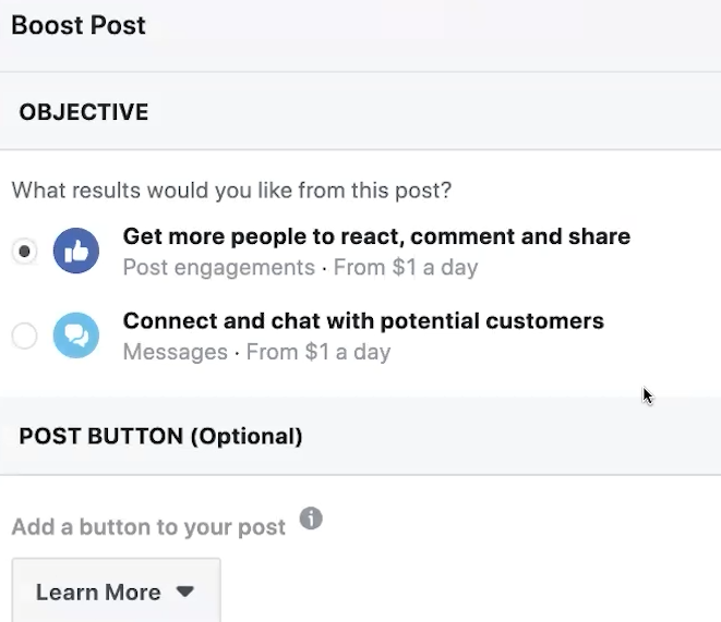 La fel ca și în cazul platformei Facebook Ads, puteți crește postările pentru orice segment de public doriți, ceea ce este foarte puternic. Deci, deși obiectivul tehnic al stimulării este implicarea, în realitate poți alege orice obiectiv pe care îl dorești pentru postare, cum ar fi generarea de lead-uri, venituri sau expunere.