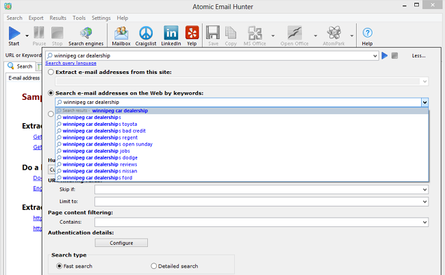 Atomic Email Hunter facilitează găsirea și colectarea adreselor de e-mail relevante pe cât posibil. Cercetarea cuvintelor cheie este una dintre cele mai bune caracteristici ale Atomic Email Hunter. Trebuie doar să introduceți câteva cuvinte cheie care sunt relevante pentru conținutul dvs. de marketing, iar acest software va începe să caute site-uri web care sunt clasate de motoarele de căutare (cum ar fi Google și Yahoo) pentru acele cuvinte cheie.