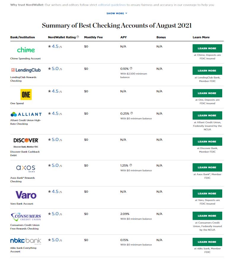 Iată cum Nerdwallet își rezumă alegerile de top pentru Cel mai bun cont de economii din august 2021. Observați cum sistemul de rating și caracteristicile cheie pe care le evaluează băncile sunt uniforme pe tot parcursul.