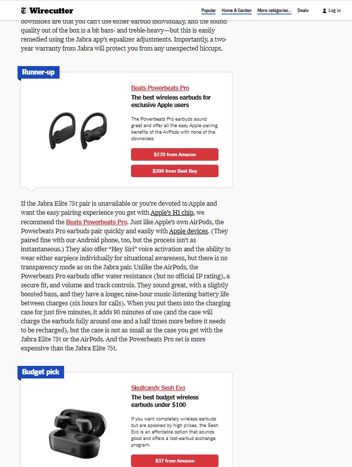 Iată un eșantion de recenzie a produsului de pe site-ul de recenzii foarte popular, Wirecutter. Puteți vedea cum și-au rezumat bine alegerea lor într-o casetă de rezumat împreună cu un link de afiliat. Pentru cineva, care se gândea deja să cumpere aceste căști Bluetooth, acesta este tot ce aveau nevoie pentru a merge mai departe.