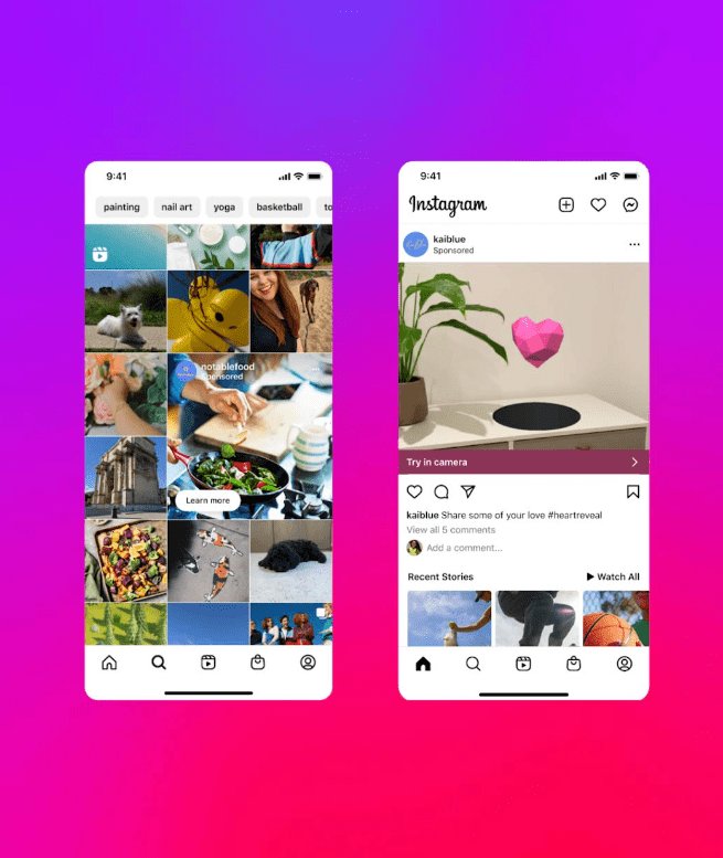 - Reclame în realitate augmentată. Disponibil atât în feed, cât și în Stories, acest tip de anunț oferă o experiență publicitară captivantă în realitate augmentată în feeduri și povești.