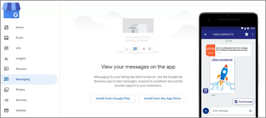 Opțiunea de mesagerie directă din aplicația Compania mea pe Google vă va ajuta să depășiți comunicarea cu clienții. Când clientul dvs. are întrebări despre produsul/serviciul dvs., acesta vă poate trimite un mesaj direct de pe oricare dintre dispozitivele lor preferate, unde veți primi instantaneu mesajul său prin Google Allo sau către sistemul dvs. de mesagerie.
