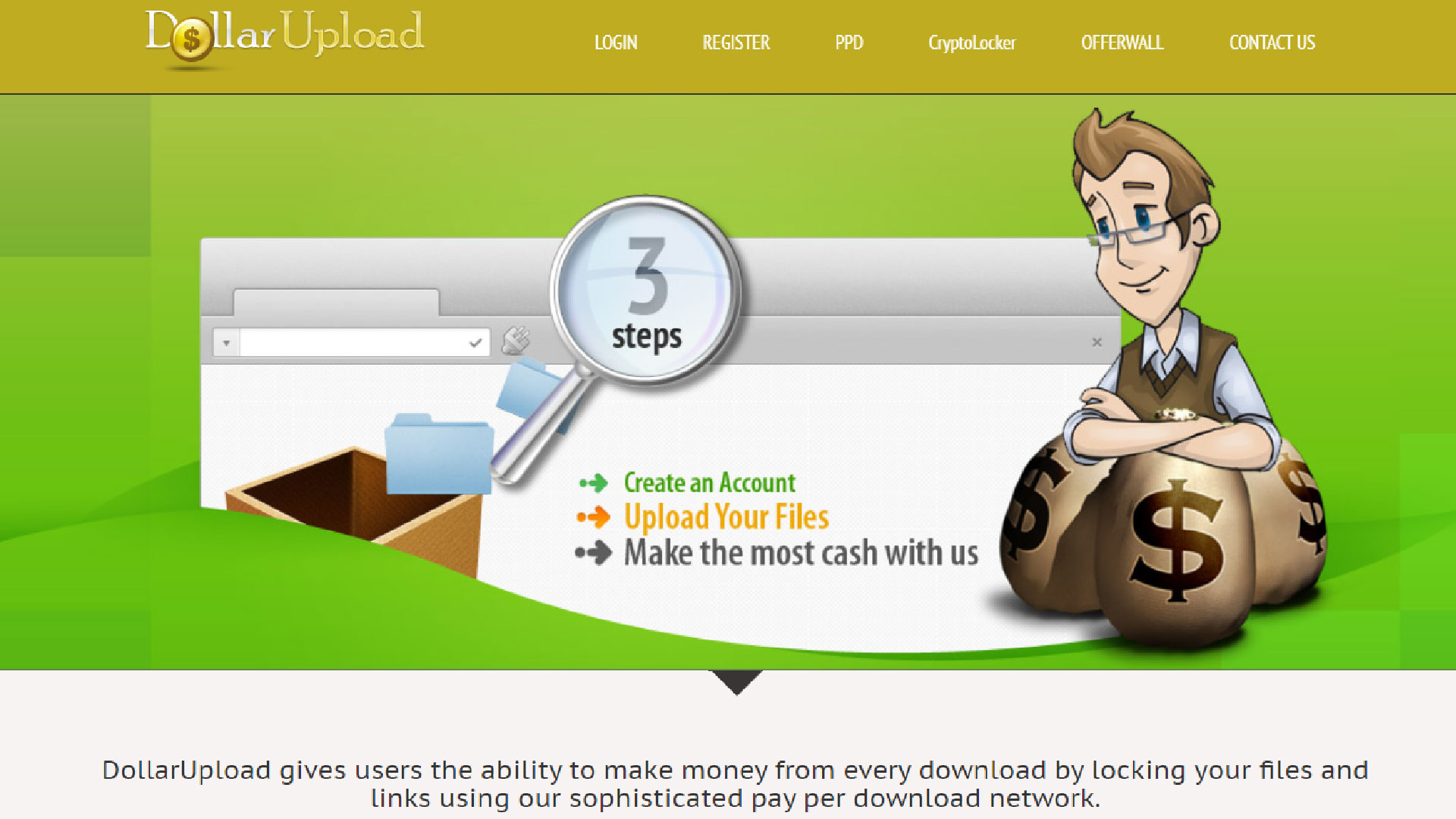 DollarUpload este printre cele mai populare site-uri Pay per Downloading de pe Internet. Vă permite să câștigați bani pentru fiecare descărcare și instalare. Trebuie doar să parcurgeți următorii pași pentru a începe: