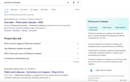 Dacă căutați afecțiuni precum boala Parkinson, va veni apoi cu un fragment de informații personalizat care se leagă de NHS și vă spune despre simptome, tratament etc. Unele dintre cele mai mari factori de trafic pentru clienții noștri din domeniul sănătății sunt întrebările despre medical afecțiuni, cum ar fi „simptomele Parkinson” sau „tratamentul diabetului”. Am observat din date că impactul probabil al acestei caracteristici SERP a fost că mai puțini utilizatori au ajuns să facă clic pe site-uri web de asistență medicală pentru aceste căutări informaționale de bază. Este încă ceva pe care îl monitorizăm, dar am observat că clienții noștri au înregistrat o pierdere de clicuri din cauza SERP-urilor fără clicuri.