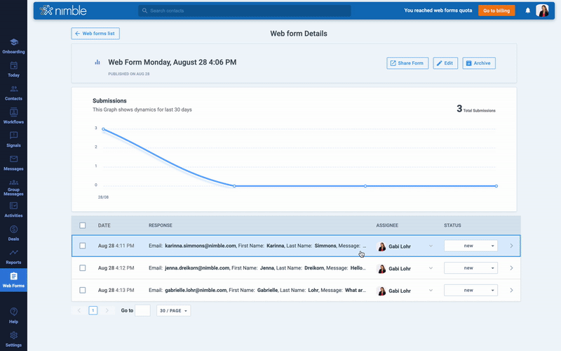 - Мгновенная интеграция с CRM: эти формы легко интегрируются с Nimble в режиме реального времени, обеспечивая немедленный доступ к данным о потенциальных клиентах для быстрого реагирования и эффективных последующих действий.