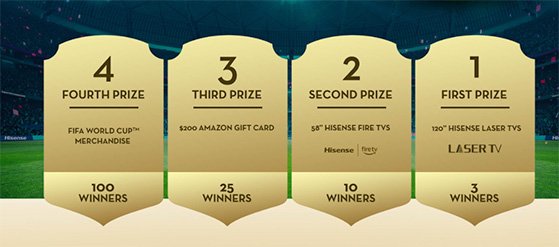 В этой кампании было 4 призовых категории, с возможностью выиграть товары чемпионата мира по футболу, подарочные карты Amazon, телевизоры Fire и лазерные телевизоры Hisense для нескольких победителей.