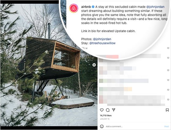 У аккаунта Airbnb в Instagram более 4,7 млн подписчиков, а у его страницы в Facebook — 16 млн подписчиков. Он также регулярно сотрудничает с влиятельными лицами в режиме реального времени для повышения вовлеченности.