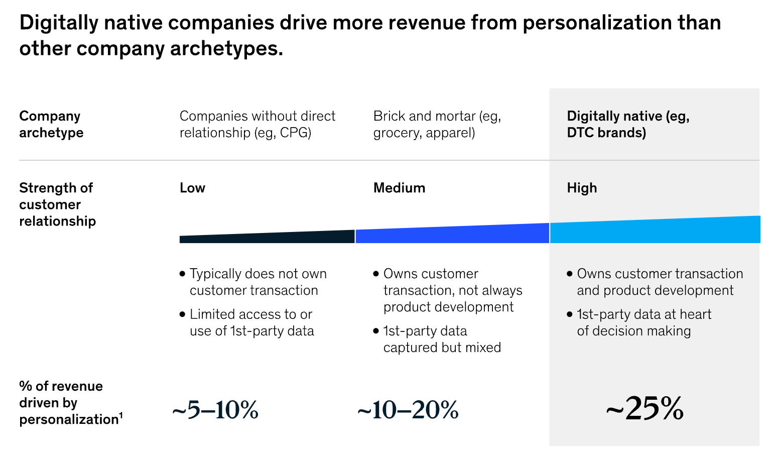 По мнению McKinsey , персонализация повышает производительность и обеспечивает лучшие результаты для клиентов. Компании, применяющие эту стратегию в обслуживании клиентов, добились среднего увеличения доходов на 10–15 %:
