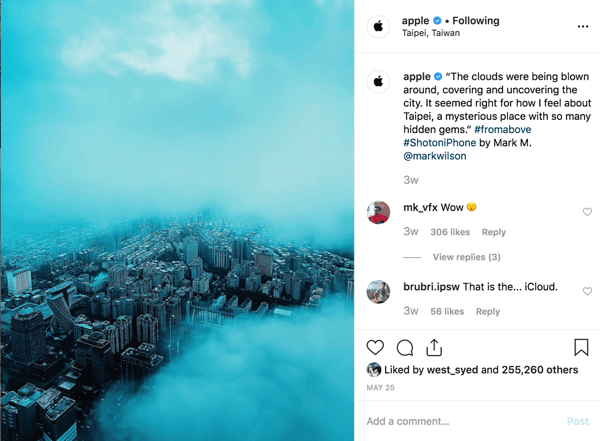 Одним из недостатков старых моделей iPhone было то, что камера не могла делать качественные снимки при плохом освещении или с большого расстояния. Чтобы противостоять критике, Apple заставляет говорить своих пользователей. Когда пользователь iPhone публикует впечатляющую фотографию в Instagram, он добавляет в подпись #ShotOnIPhone, а Apple выбирает лучшие и публикует их в своем аккаунте.