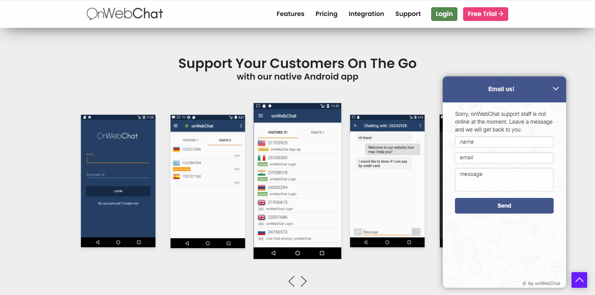 OnWebChat — это служба живого чата, целью которой является повышение удовлетворенности ваших клиентов. Он включает в себя такие функции, как обмен файлами, ярлыки и информацию о наборе текста. Вы можете вести базу знаний клиентов и отслеживать своих клиентов в режиме реального времени. У него есть только приложение для Android, чтобы общаться на ходу.