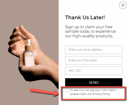 Создайте страницу политики конфиденциальности и установите флажок политики конфиденциальности во всплывающих окнах и веб-формах. Следовательно, когда люди доверяют вам, они с большей вероятностью будут заполнять ваши лид-формы.