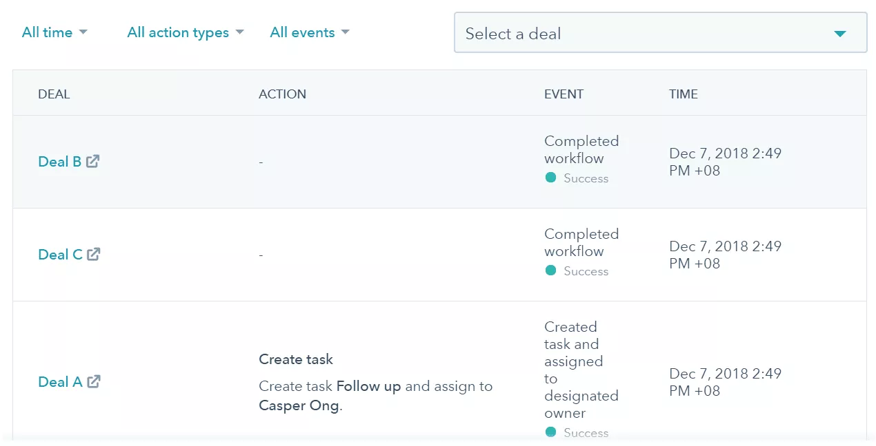 Еще одна замечательная функция в рабочих процессах HubSpot — вкладка «История». Вы можете увидеть очень подробное представление обо всех действиях пользователя, выполненных в этом потоке, и даже отфильтровать их по конкретным действиям.