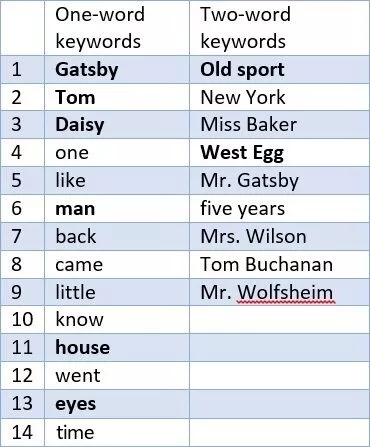 Если вы отфильтруете имена персонажей из списка ключевых слов, состоящих из одного слова, выделится несколько слов, а именно: дом, глаза и время, которые являются важными тематическими элементами «Великого Гэтсби». Вместе ключевые слова «время», «дом» и «глаза» действительно указывают на основные темы при дальнейшем изучении: одержимость прошлым (время), озабоченность богатством и материализмом (дом) и модернистский отход от Бога ( глаза).