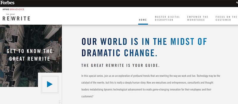 BrandVoice от Forbes — это площадка для нативной рекламы и спонсируемого контента. Многие бренды создают собственный контент BrandVoice. Он фокусируется на таких компаниях, как Mitsubishi Heavy Industries, SAP, Deloitte и т. д. Компания KPMG подняла свой нативный контент в Forbes на новый уровень с помощью кампании под названием «Великое переписывание». Эта нативная рекламная кампания объединяет KPMG с будущим инноваций, постоянно добавляя новые «главы» о различных секторах.