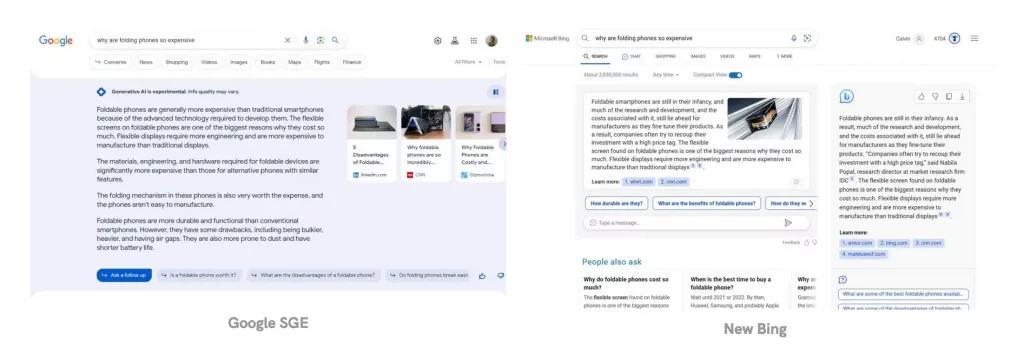 Bing добавляет плотное поле ответа с пронумерованными ссылками на источники, в то время как SGE от Google занимает всю страницу и не включает в текст никаких ссылок. Вот пример сравнения двух: