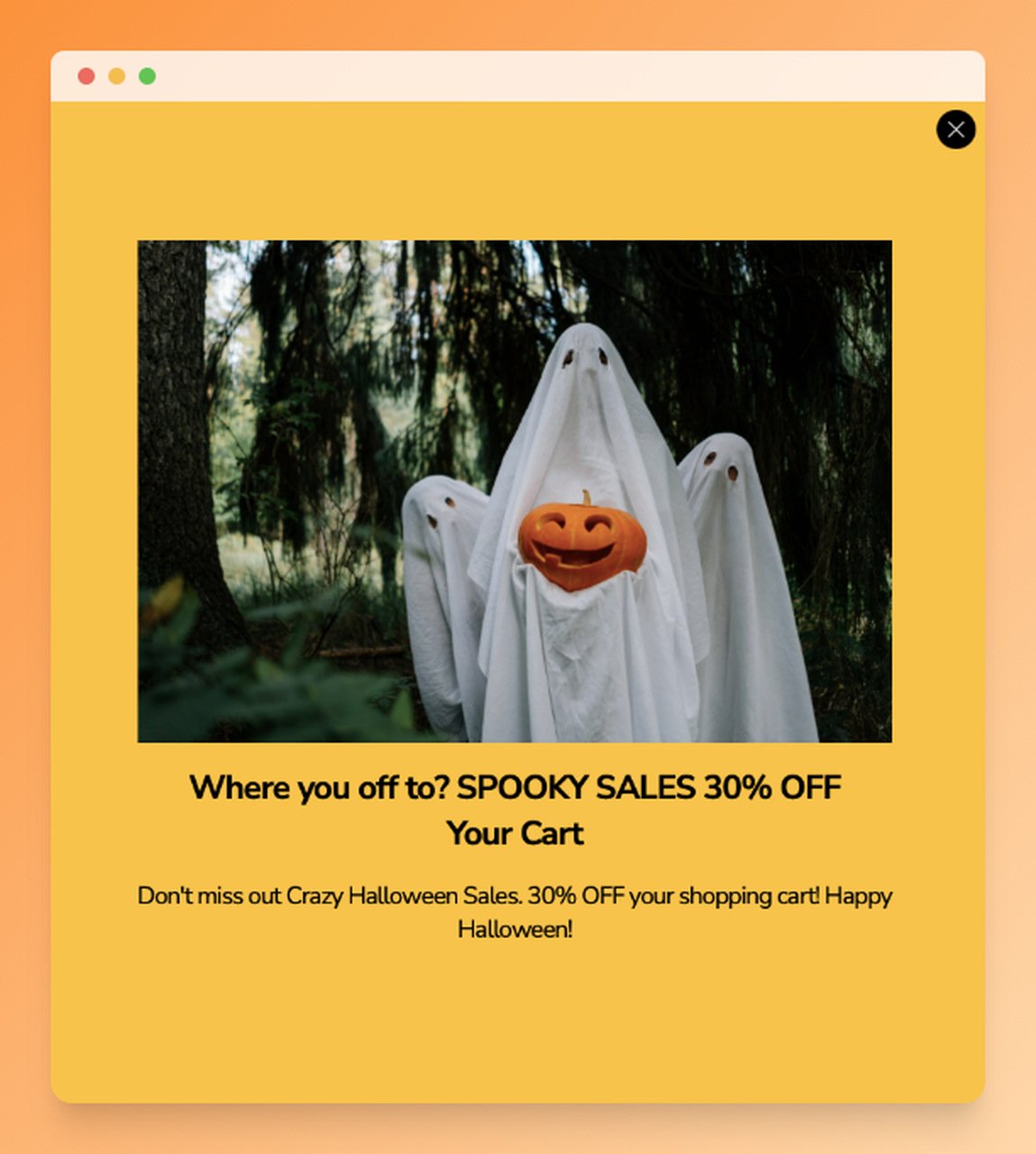 Вы можете использовать такие всплывающие окна, чтобы предлагать скидки своим посетителям. Создавая праздничное всплывающее окно, вы можете отразить дух праздников! Если вам нравится этот жуткий стиль всплывающих окон на Хэллоуин, вы можете клонировать его из нашей витрины всплывающих окон.