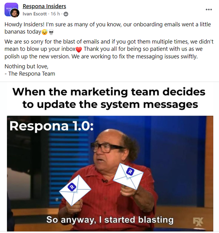 Вот пример мема, который менеджер по маркетингу Respona Иван придумал в группе Respona (реквизит ему):