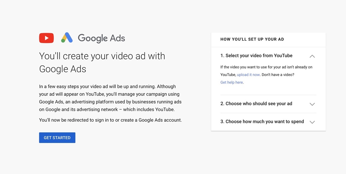 เมื่อคุณตั้งค่าโฆษณาวิดีโอ ให้ไปที่โฆษณา YouTube แล้วเลือก "เริ่มเลย" แท็บใหม่จะเปิดขึ้น ซึ่งจะนำคุณไปยังบทความนี้ โดยอธิบายสามขั้นตอนที่จำเป็นในการเริ่มโฆษณาบน YouTube: