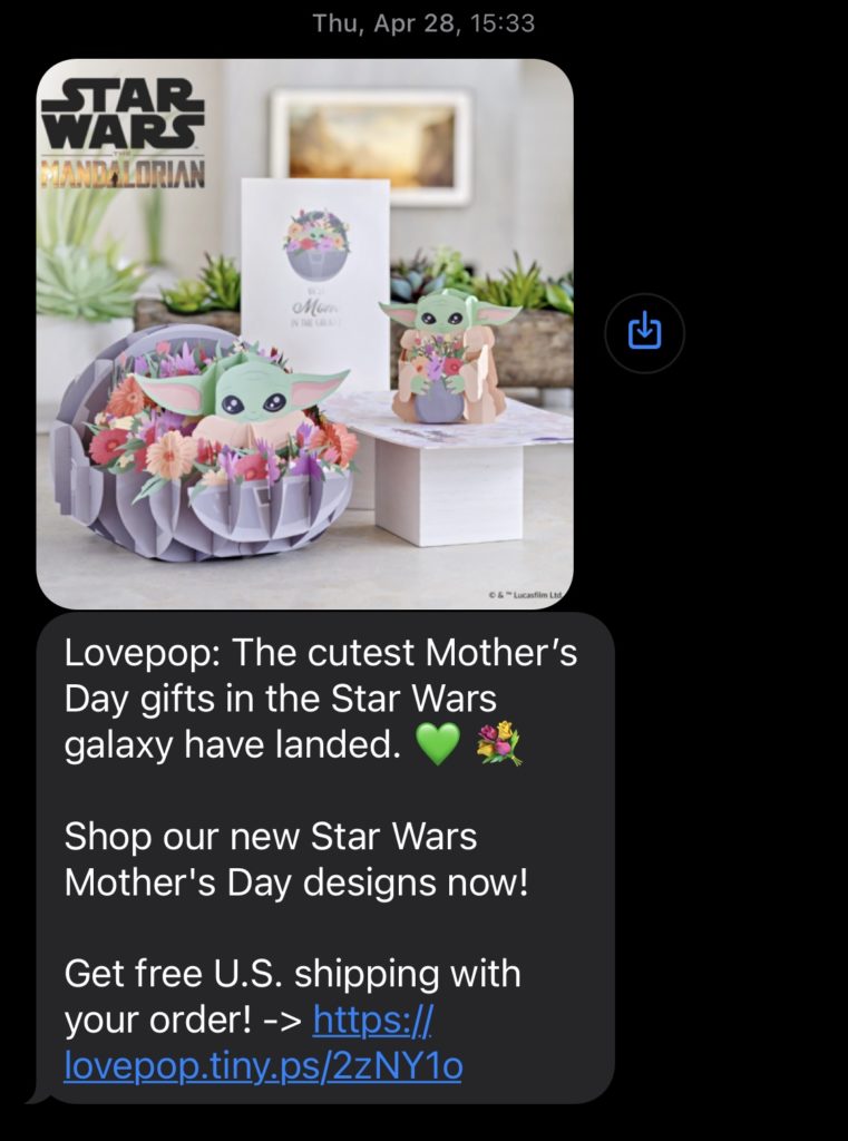 คุณมีการเปิดตัวผลิตภัณฑ์หรือบริการใหม่หรือไม่? กระจายข่าวดีผ่านข้อความ! คุณสามารถทำให้การประกาศดังกล่าวเป็นการเฉลิมฉลองที่พิเศษยิ่งขึ้นด้วยการใส่รูปภาพและอิโมจิ เช่น Lovepop ด้านล่าง: