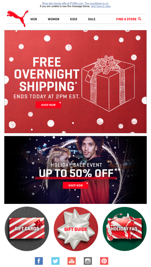 นี่เป็นหนึ่งในอีเมลการขายช่วงวันหยุดจาก Puma ที่ส่งไปในเช้าของวันก่อนคริสต์มาส จดหมายมีโครงสร้างที่เรียบง่ายและประกอบด้วยองค์ประกอบมาตรฐาน - แบนเนอร์หลายอัน ลิงก์ไปยังโปรโมชั่นเพิ่มเติม แถบนำทาง และปุ่มโซเชียลมีเดีย