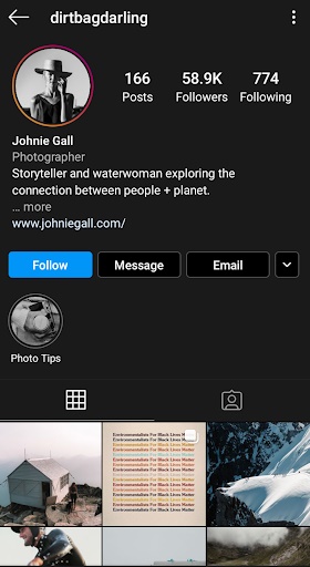 Johnie Gall ยังเป็นที่รู้จักในนาม @dirtbagdarling บน Instagram เธอเป็นผู้นำในกิจกรรม Instagram และเธอได้รับข้อเสนอมากมายจากแบรนด์ใหญ่ ๆ ให้ทำภารกิจ รวมถึง Patagonia