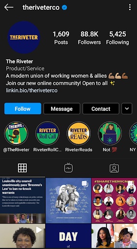 The Riveter อธิบายว่าเป็นแพลตฟอร์มการทำงานและชุมชนสำหรับสตรีและผู้สนับสนุน พวกเขาเลือกที่จะโต้ตอบกับผู้ชมบน Instagram ผ่านการสนทนา เนื้อหาของการสนทนาเหล่านี้มักจะเกี่ยวกับผู้หญิงในธุรกิจและความเป็นผู้นำ The Riveter ได้กลายเป็นผู้มีอิทธิพลอย่างแท้จริงในเรื่องนี้ The Riveter มีความชัดเจนมากเกี่ยวกับภารกิจของพวกเขา และพวกเขาใช้ Instagram เป็นเครื่องมือในการแนะนำกิจกรรม ตลอดจนเชิญการมีส่วนร่วมของชุมชนทั้งหมด
