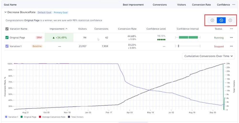 - อัตราการแปลงเมื่อเวลาผ่านไป : แกน Y แสดงอัตราการแปลง แกน X แสดงเวลา แต่ละบรรทัดแสดงถึงรูปแบบต่างๆ (อัตรา Conversion สะสม) + หนึ่งรายการสำหรับอัตรา Conversion ของการทดสอบทั้งหมด (ค่าเฉลี่ยของรูปแบบทั้งหมด) + แกนที่สอง Y ทางด้านขวา ซึ่งแสดงถึงจำนวนผู้เข้าชมสะสมภายในการทดสอบทั้งหมด