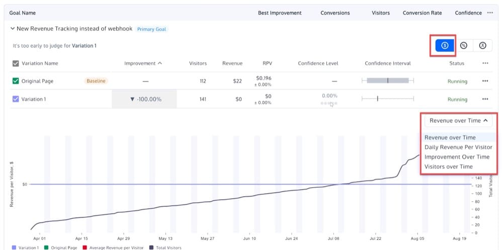 - รายได้ในช่วงเวลา : รายได้เฉลี่ยสะสมต่อผู้เข้าชม – แกน Y แสดงรายได้เฉลี่ยต่อผู้เข้าชม แกน X แสดงเวลา แต่ละบรรทัดแสดงถึงหนึ่งรูปแบบ (รายได้เฉลี่ยต่อผู้เข้าชม) + หนึ่งรายการสำหรับรายได้เฉลี่ยต่อผู้เข้าชมของการทดสอบทั้งหมด (ค่าเฉลี่ยของรูปแบบทั้งหมด) + แกนที่สอง Y ทางด้านขวา ซึ่งแสดงถึงจำนวนผู้เข้าชมสะสมภายในการทดสอบทั้งหมด