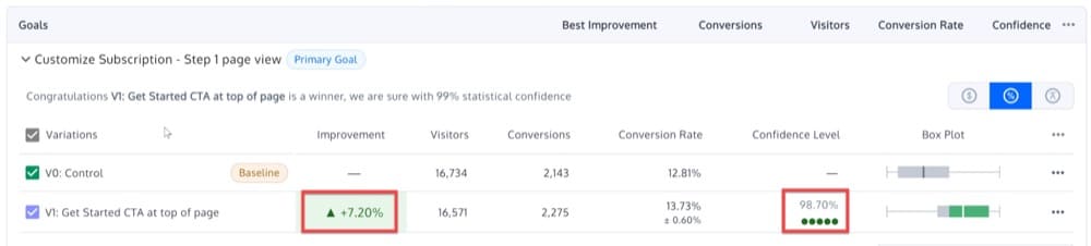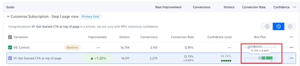 สำหรับเป้าหมาย "ปรับแต่งการสมัครรับข้อมูล - การดูหน้าเว็บขั้นตอนที่ 1" รูปแบบที่ 1 มีโอกาส 98.7% ที่จะเอาชนะรูปแบบ 0 (ดั้งเดิม) ในประสบการณ์นี้ แผนภาพกล่องแสดงให้เห็นว่าการเลือกรูปแบบ 1 สามารถส่งผลให้มีการปรับปรุงมากกว่าเดิม 13.73% +- 0.6%