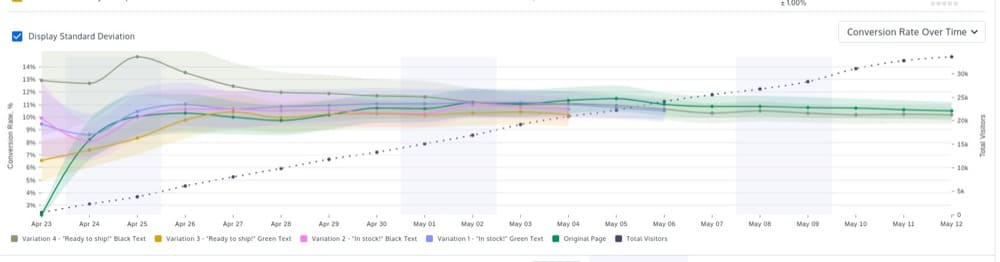 - ผลิตภัณฑ์ต่อผู้เข้าชม : ผลิตภัณฑ์ที่สั่งซื้อเฉลี่ยสะสมต่อผู้เข้าชม – แกน Y แสดงผลิตภัณฑ์ที่สั่งซื้อโดยเฉลี่ยต่อผู้เข้าชม แกน X แสดงเวลา แต่ละบรรทัดแสดงถึงรูปแบบต่างๆ (ผลิตภัณฑ์ที่สั่งซื้อโดยเฉลี่ยสะสมต่อผู้เข้าชม) + บรรทัดหนึ่งสำหรับผลิตภัณฑ์ที่สั่งซื้อโดยเฉลี่ยต่อผู้เข้าชมของการทดสอบทั้งหมด (ค่าเฉลี่ยของรูปแบบทั้งหมด) + แกนที่สอง Y ทางด้านขวาซึ่งแสดงถึงจำนวนผู้เข้าชมสะสมภายในการทดสอบทั้งหมด .