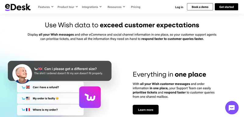 ขายผลิตภัณฑ์ของคุณทั่วโลก? ไม่มีปัญหา. ด้วยการผสานรวม Wish ของ eDesk คุณสามารถใช้คุณสมบัติการแปลอัตโนมัติเพื่อเชื่อมต่อกับลูกค้าทั่วโลกสำหรับข้อความสนับสนุนขาเข้าและขาออก คุณจะพูดภาษาของลูกค้าของคุณจริงๆ