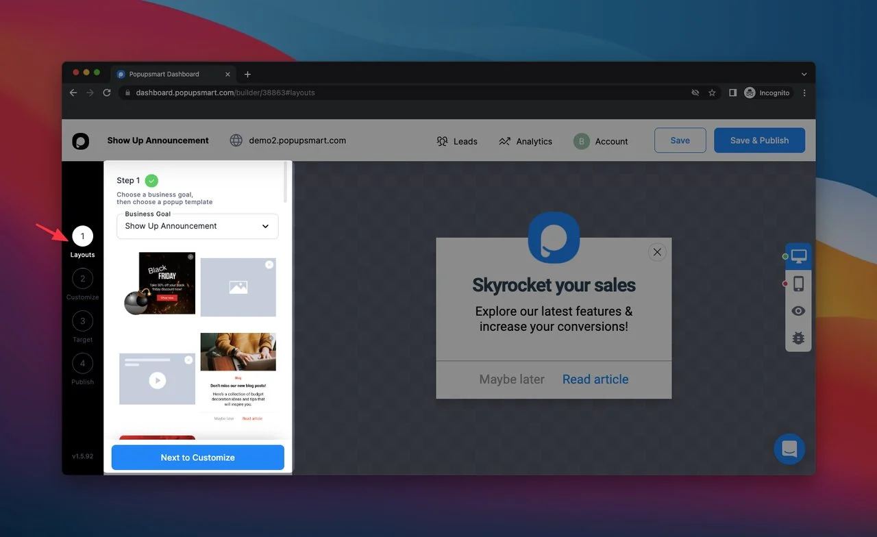 เมื่อคุณเลือกเค้าโครงที่เหมาะสมเสร็จแล้ว ให้คลิกปุ่ม "ถัดไปเพื่อปรับแต่ง" หน้า "ปรับแต่ง" จะปรากฏขึ้น คุณสามารถปรับแต่งป๊อปอัปของคุณได้ในส่วนนี้