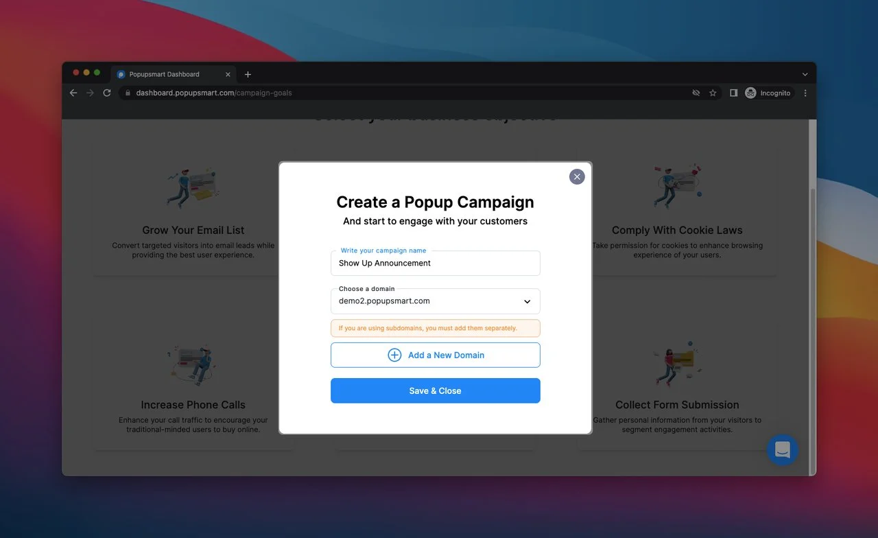 หลังจากเลือกวัตถุประสงค์แล้ว หน้าต่าง "สร้างแคมเปญป๊อปอัป" จะปรากฏขึ้น คุณสามารถเขียนชื่อแคมเปญของคุณในส่วนนี้และเพิ่มโดเมนของคุณ หลังจากเพิ่มแล้วให้คลิกที่ปุ่ม "บันทึกและปิด"