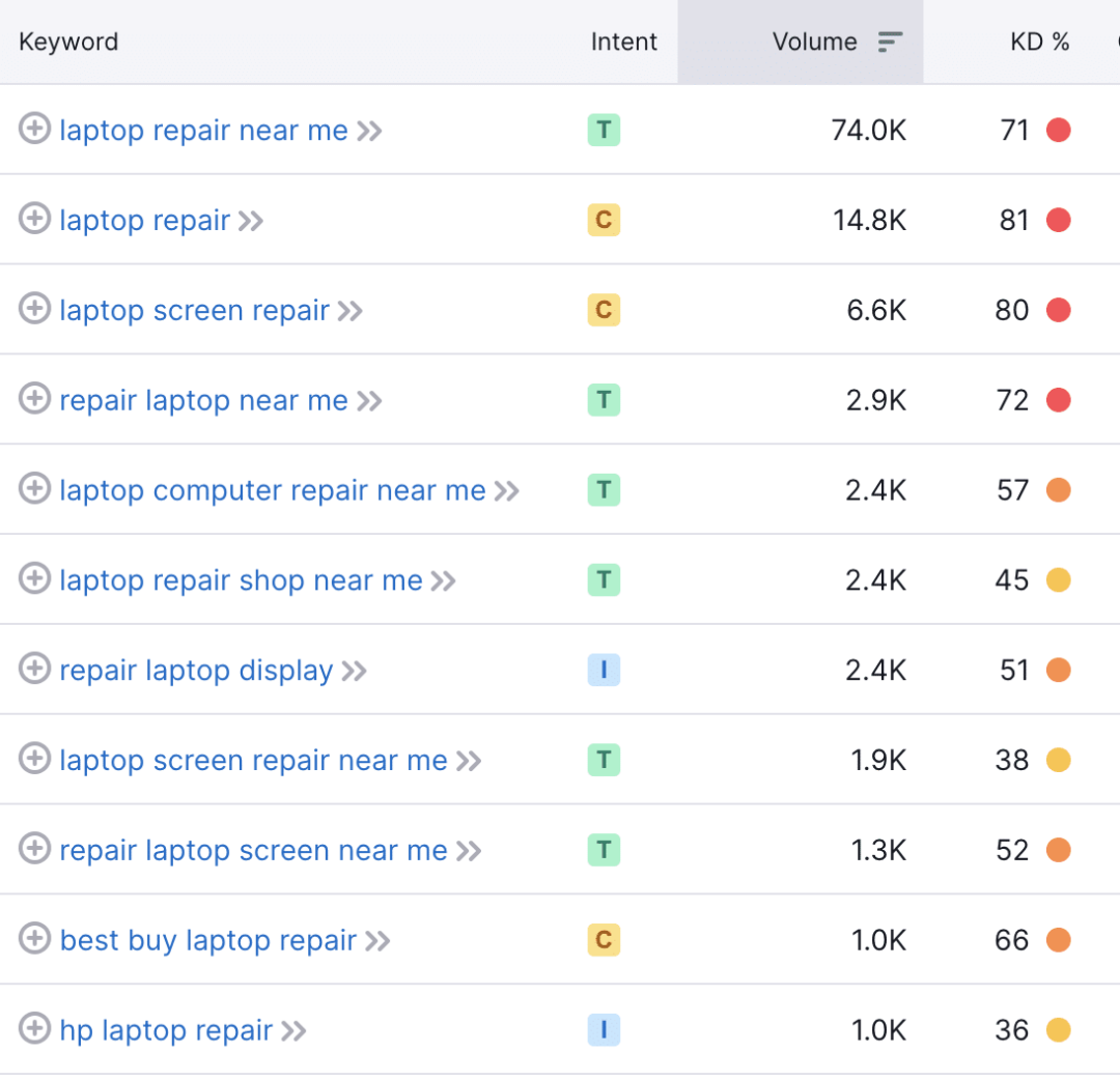 ตัวอย่างเช่น จะเกิดอะไรขึ้นเมื่อคุณค้นหาคำว่า "ซ่อมแล็ปท็อป" คุณจะเห็นชื่อใหญ่ๆ เช่น Best Buy และบริการซ่อมของ HP ปรากฏขึ้นในหน้าแรก ธุรกิจซ่อมแล็ปท็อปขนาดเล็กจะต้องดิ้นรนเพื่อให้ได้รับตำแหน่งสูงสำหรับคำหลักนั้น อย่างไรก็ตาม คำว่า "ซ่อมหน้าจอแล็ปท็อปใกล้ฉัน" มีการแข่งขันน้อยกว่ามาก สาเหตุหลักมาจากคุณจะแข่งขันกับร้านค้าอื่นๆ ในพื้นที่ที่มีการนำเสนอทางดิจิทัลซึ่งอาจสร้างเนื้อหาในหัวข้อนั้นด้วย