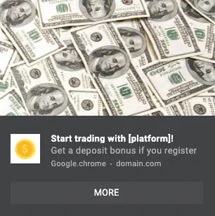 Geçiş reklamları, Push ile aynı mantığa sahiptir - para yatırma ve kayıt bonusları burada harika çalışır. Bu tür resimler, banner'lar veya iniş öncesi reklam öğeleri olarak kullanılabilir. İşte bir Geçiş reklamı örneği: