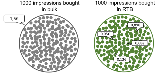 Aşağıdaki resim bu farkı resmediyor. Sol tarafta, toplu olarak satın alınan gösterimleri göreceksiniz; sağda, RTB işlemini kontrol edebilirsiniz.