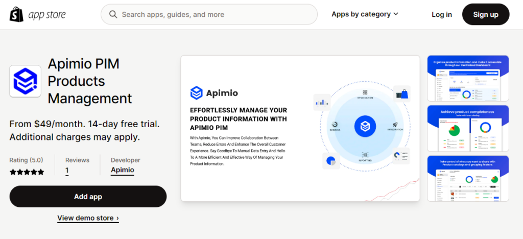 Shopify yönetici kontrol panelinizde Shopify App Store'a gidin ve Apimio PIM uygulamasını arayın.
