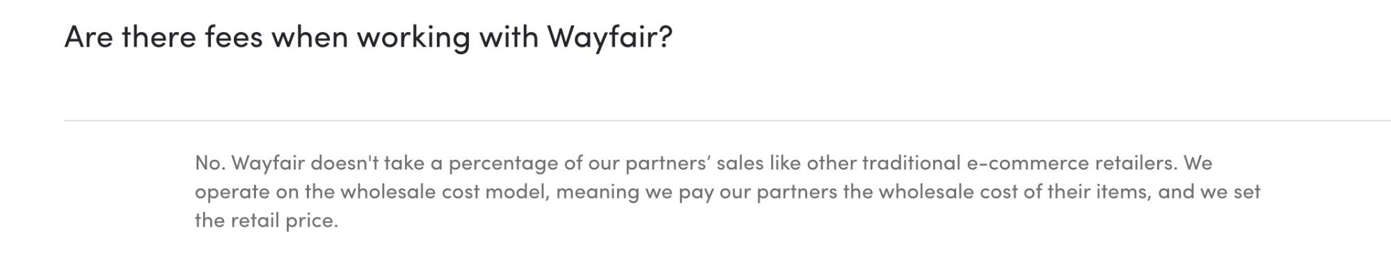 Diğer e-ticaret sitelerinden farklı olarak Wayfair, ortaklarından yüzde ücreti talep etmez. Perakende fiyatı belirleyerek toptan maliyet modelini uygulayarak çalışır. Wayfair, perakendecilerin satışlarından kar elde edebilmeleri için ortaklarına ürünlerinin satış maliyetini öder.