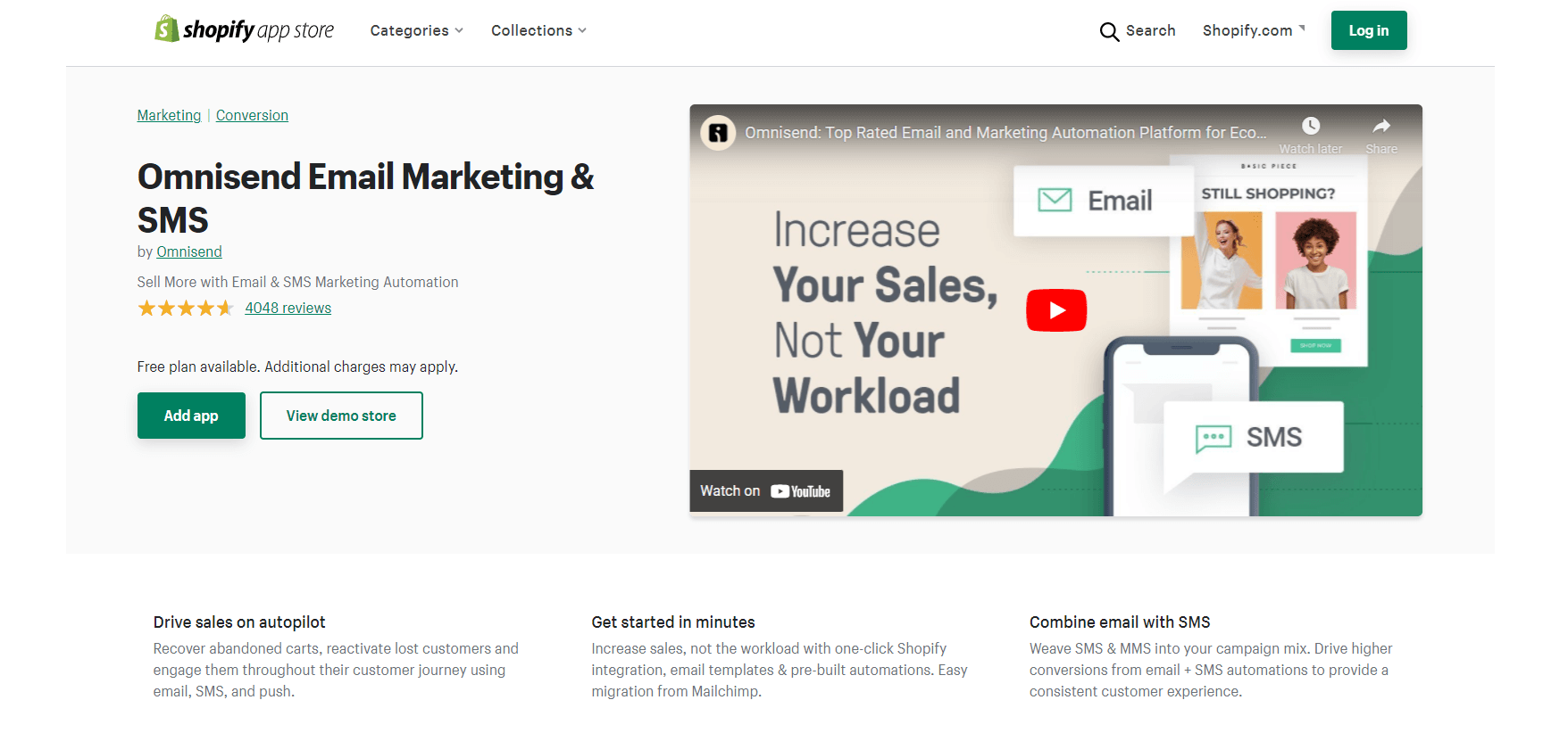 E-ticaret mağazaları için hepsi bir arada çok kanallı otomasyon çözümü olan Omnisend, Shopify dahil çoğu E-ticaret platformuyla çalışır. Segmentlere ayrılmış hedef kitlenizle SMS pazarlama, Google, Facebook yeniden hedefleme reklamları, Messenger, push bildirimleri ve diğer kanalları tek bir iletişim akışına ekleyebilirsiniz.