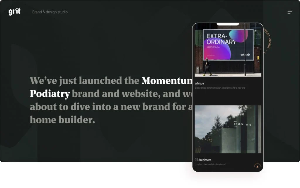 Kaydırma efektlerinin kullanımı, izleyiciye bir sergiye benzer bir yolculuğa çıkarıldığı hissini veriyor, her proje bir vitrin görevi görüyor ve tipik bir simetrik tasarımı takip etmiyor. Tıklanabilir proje sayfalarının kendileri karmaşık bir şekilde ayrıntılıdır. Aslında, web sitesi ilginç bir şekilde en son büyük projesi olan Momentum Podiatry'den kahramanın kendisinde bahsediyor.