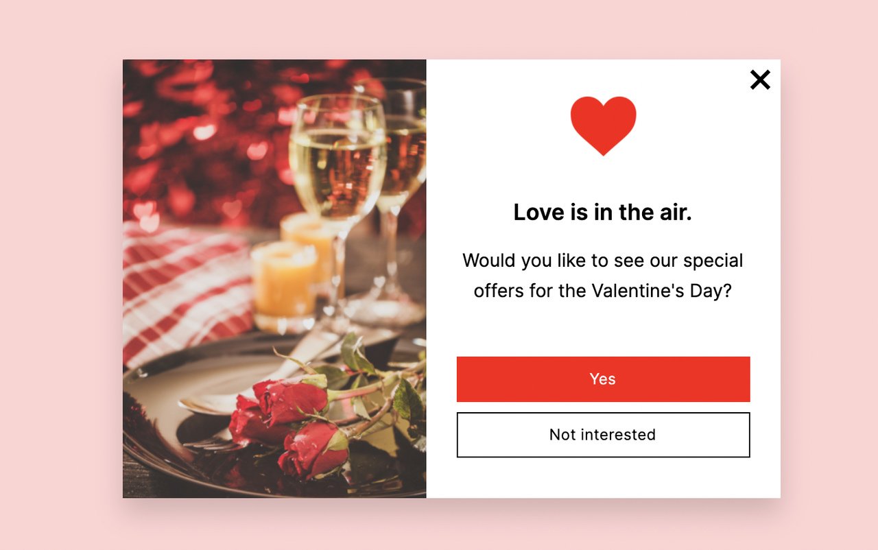 Müşterilerinize güzel bir açılır pencere ile Sevgililer Günü için indirim sunun.