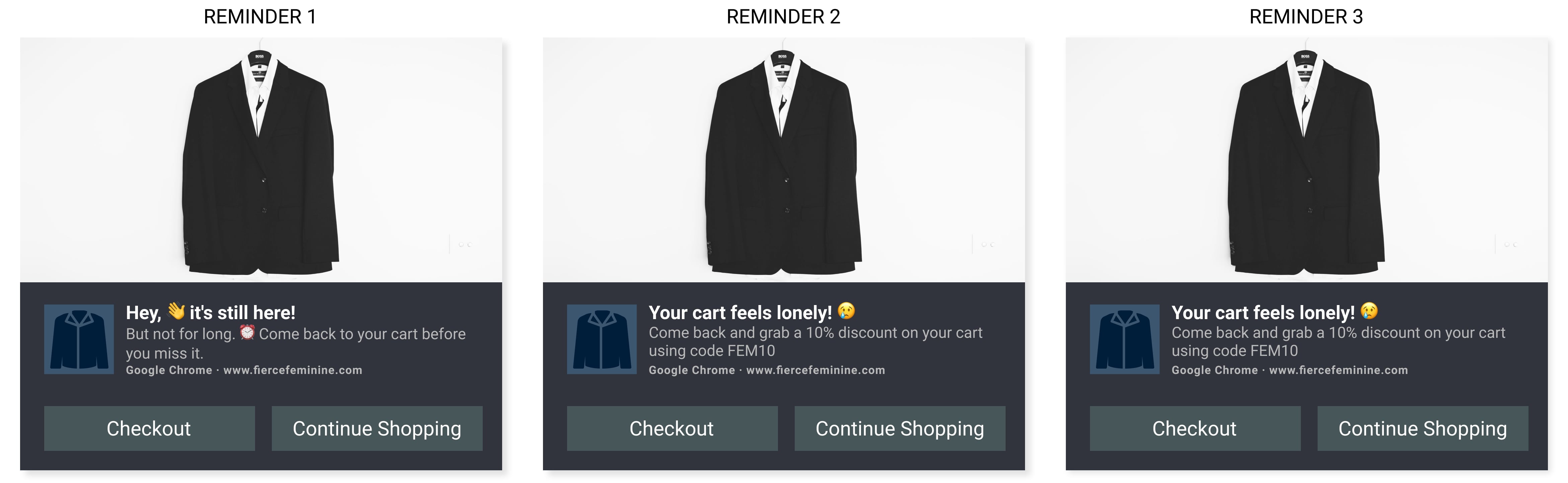 En güçlü web push özelliklerinden biri, terk edilmiş sepet hatırlatıcısıdır. Bu otomasyon, alışveriş sepetini terk eden aboneleri ödeme sayfasına geri getirmek için otomatik olarak gönderilen 3 bildirimlik bir dizi oluşturmanıza olanak tanır. Headphone Zone gibi markalar, sadece 7 ayda terk edilmiş sepet hatırlatıcılarından 123.279 $ kazanmayı başardı!
