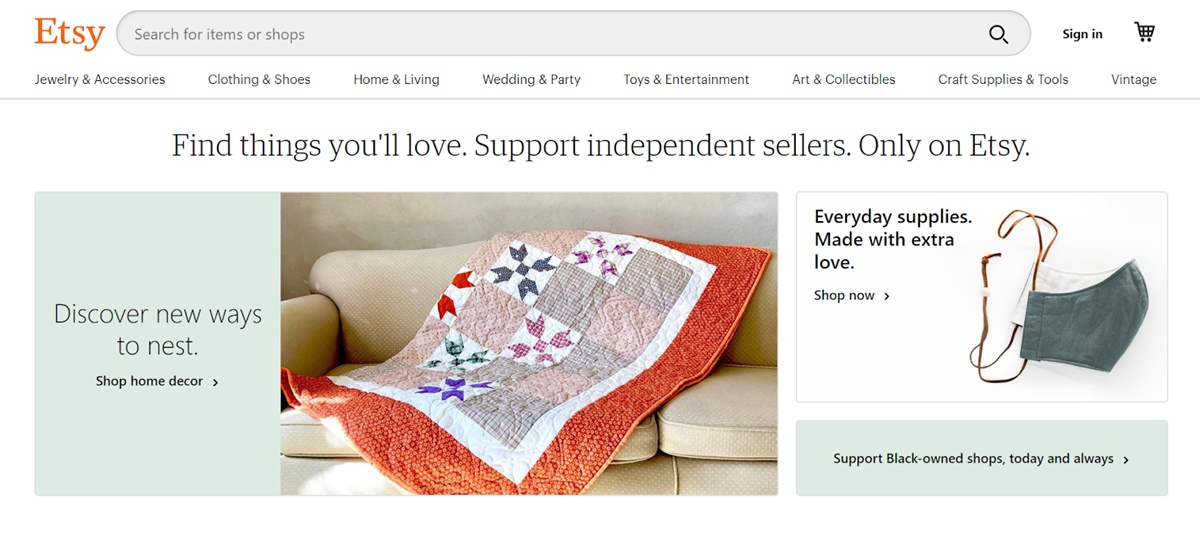 Etsy, esas olarak el yapımı veya eski ürünlere odaklanan bir Amerikan e-ticaret platformudur. Etsy'deki ürünler, giyim, ev dekorasyonu, çanta, mücevherden el işi malzemelerine kadar çeşitli kategorilerde çeşitlilik gösterir.