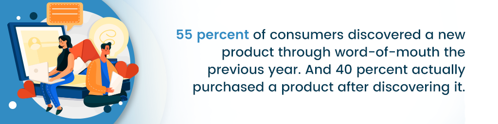 此外, 2021 年的一项调查发现,55% 的消费者在前一年通过口碑发现了新产品。 40% 的人在发现产品后实际上购买了该产品。