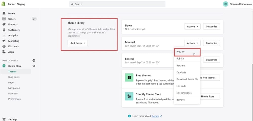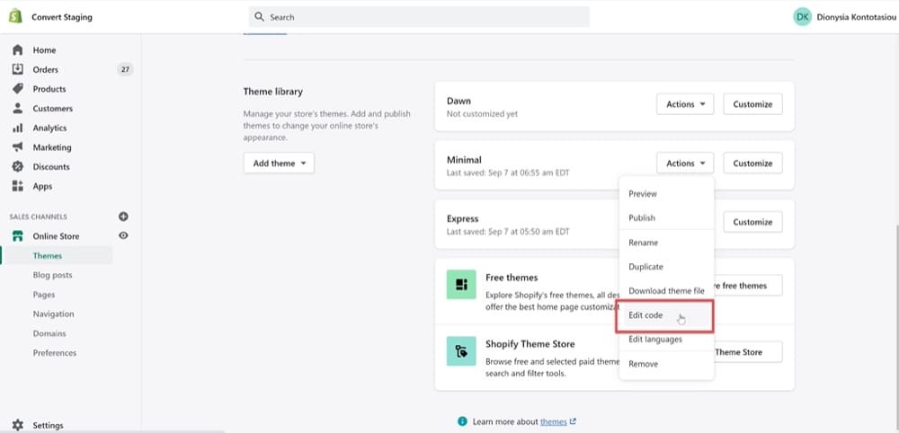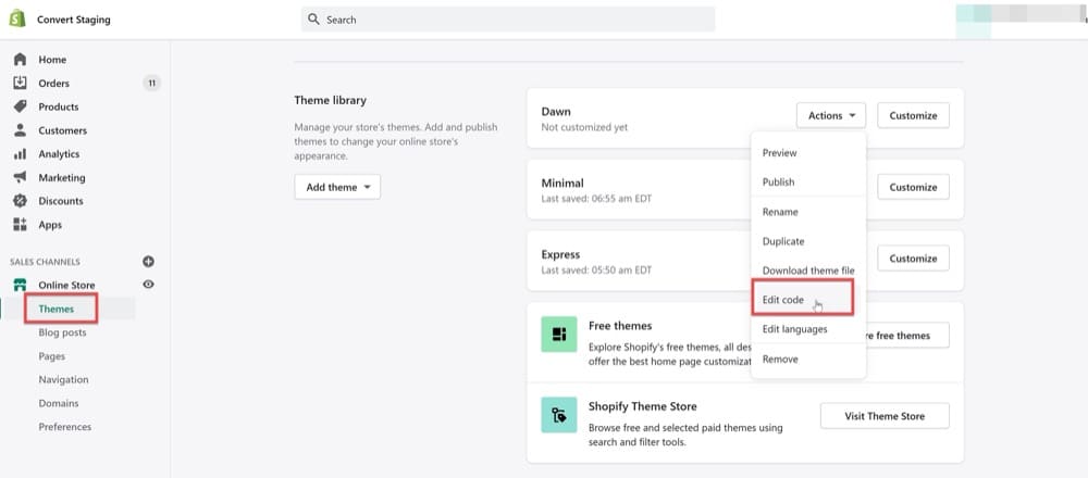首先转到销售渠道 > 在线商店 > 主题 > 主题库 >(选择您想要的主题)> 编辑代码。