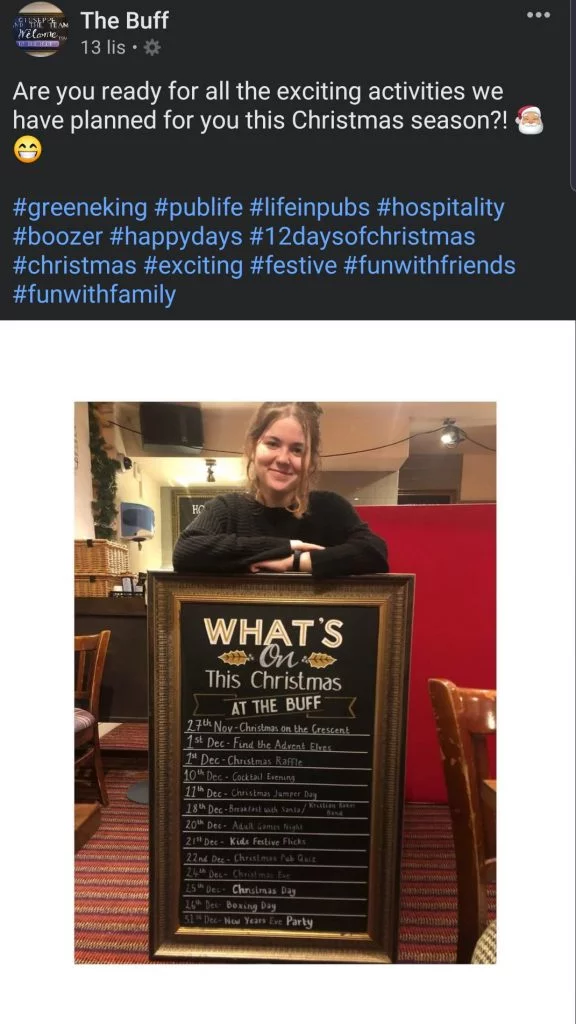 您是否在为圣诞节装饰的城镇广场或类似地方经营企业? 您可以创建圣诞节 Facebook 帖子,在其中展示您的咖啡馆、餐厅、沙龙、书店等周围的美丽装饰。走在灯火通明的主要街道和闪烁的冬季装饰品中,表明您的商店值得一看。